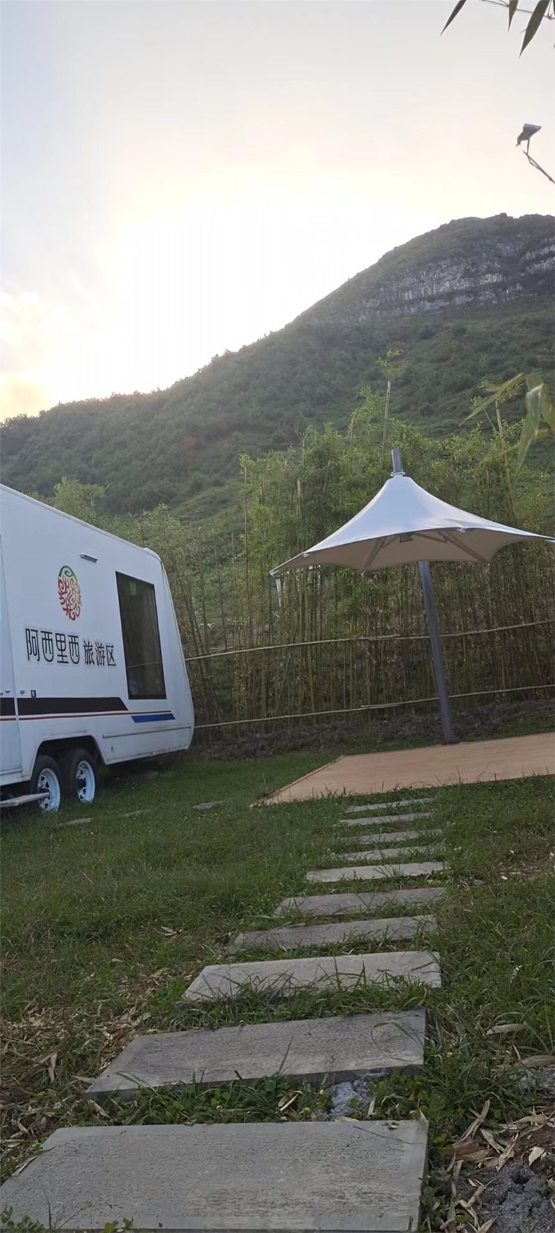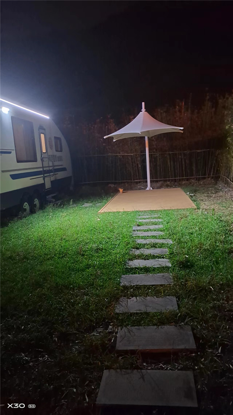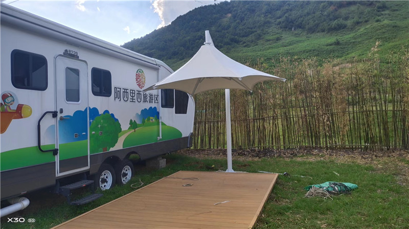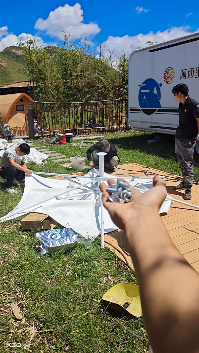赫章阿西里西星空露营基地张拉膜遮阳伞完工并交付,该项目为轻钢型张拉膜,建立于阿西里西星空基地,它那优美的曲线,洁白的外衣,在结合大草原的青青草地,星空浩瀚,从此草原上有多了一道亮丽的风景线。